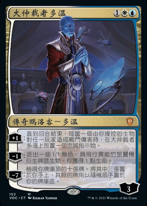 ![]() Variations— Parts— | 大仲裁者多溫+1:直到回合結束,每當一個由你操控的生物對任一玩家造成戰鬥傷害時,在大仲裁者多溫上放置一個忠誠指示物。 −1:派出一個1/1無色,具飛行異能的振翼機衍生神器生物。你獲得1點生命。 -7:檢視你牌庫頂的十張牌。將其中三張置於你手上,其餘的牌則以隨機順序置於你的牌庫底。