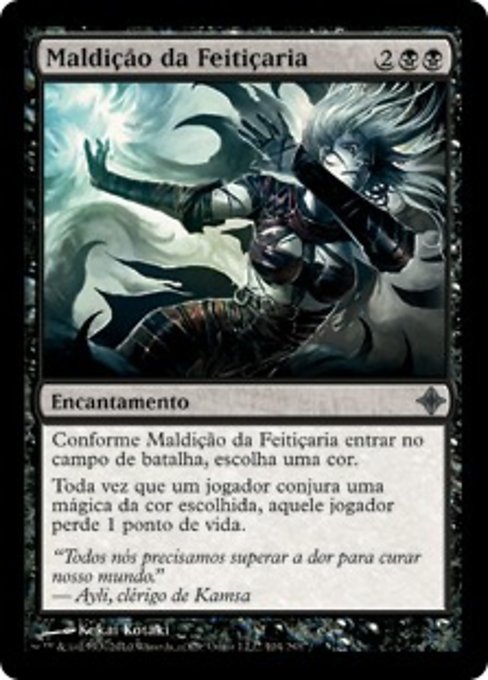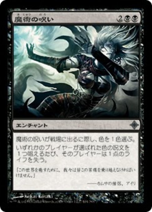 ![]() Variations— Parts— | Curse of WizardryAs this enchantment enters, choose a color. Whenever a player casts a spell of the chosen color, that player loses 1 life.