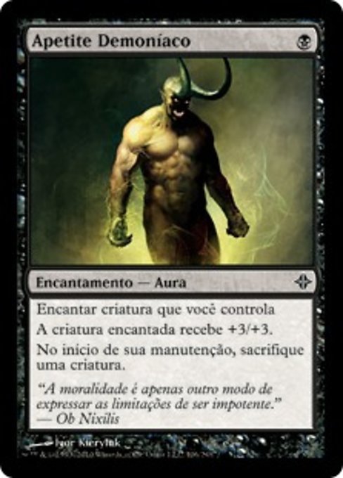 ![]() Variations— Parts— | Demonic AppetiteEnchant creature you control Enchanted creature gets +3/+3. At the beginning of your upkeep, sacrifice a creature.