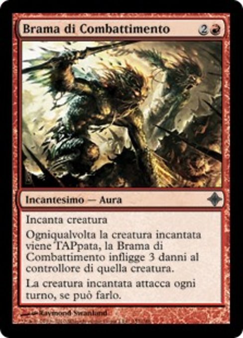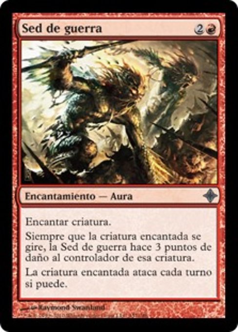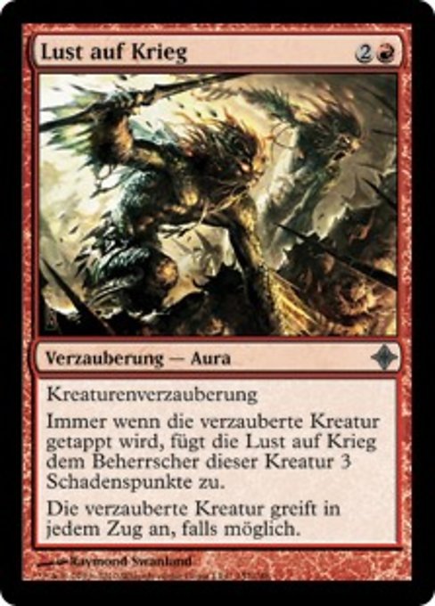 ![]() Variations— Parts— | Lust for WarEnchant creature Whenever enchanted creature becomes tapped, this Aura deals 3 damage to that creature's controller. Enchanted creature attacks each combat if able.