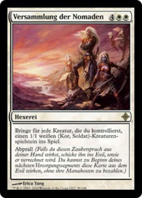 ![]() Variations— Parts— | Adunata dei NomadiMetti sul campo di battaglia una pedina creatura Soldato Kor 1/1 bianca per ogni creatura che controlli. Ripresa (Se lanci questa magia dalla tua mano, esiliala quando si risolve. All'inizio del tuo prossimo mantenimento, puoi lanciare questa carta dall'esilio senza pagare il suo costo di mana.)