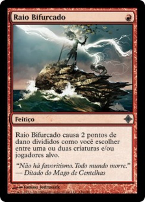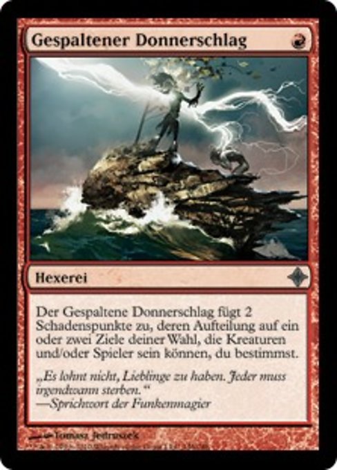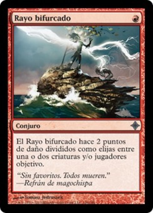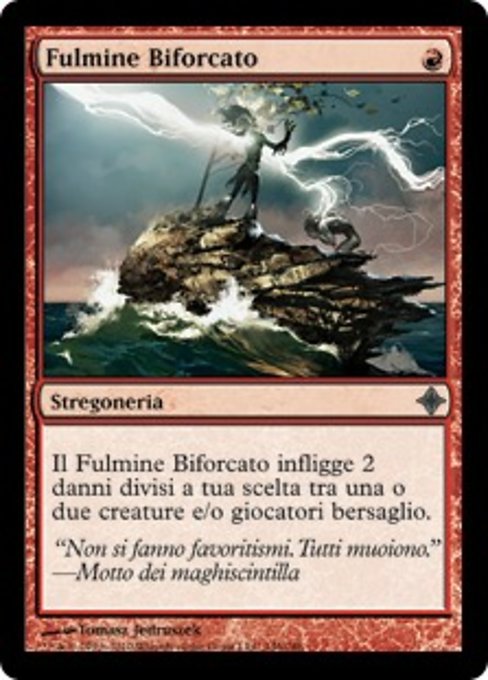 ![]() Variations— Parts— | 二股の稲妻クリーチャーやプレイヤーを、1つまたは望む組み合わせで2つ対象とする。二股の稲妻はそれらに、2点のダメージを好きなように分割して与える。