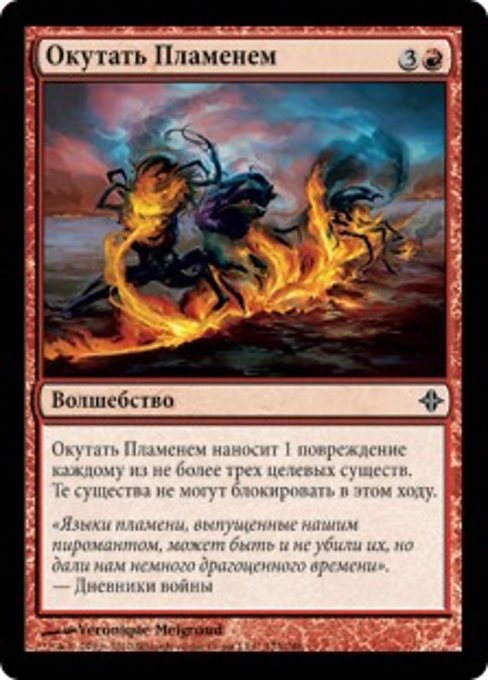 ![]() Variations— Parts— | Envolver em ChamasEnvolver em Chamas causa 1 ponto de dano a cada uma de até três criaturas alvo. Essas criaturas não podem bloquear neste turno.