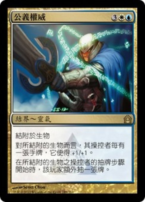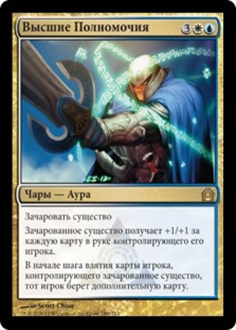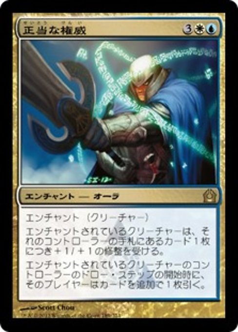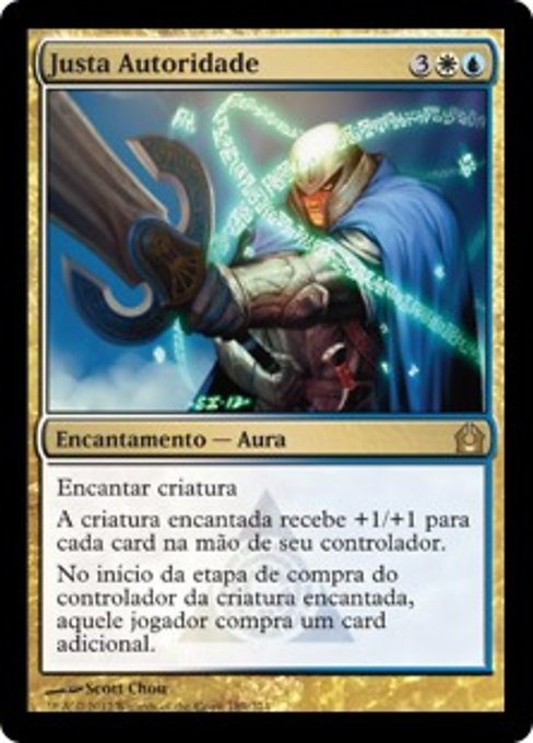 ![]() Variations— Parts— | Autoridad justaEncantar criatura. La criatura encantada obtiene +1/+1 por cada carta que haya en la mano de su controlador. Al comienzo del paso de robar del controlador de la criatura encantada, ese jugador roba una carta adicional.