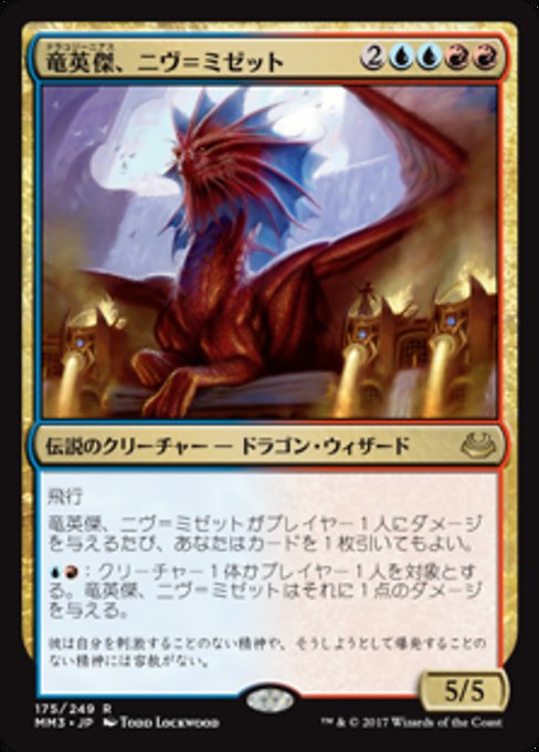 |  Variations— Parts— | 竜英傑、ニヴ=ミゼット5 / 5 飛行 竜英傑、ニヴ=ミゼットがプレイヤー1人にダメージを与えるたび、あなたはカードを1枚引いてもよい。