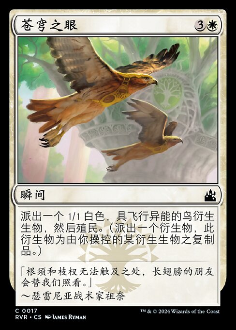 ![]() Variations— Parts— | 苍穹之眼将一个1/1白色,具飞行异能的鸟衍生生物放进战场,然后殖民。(将一个衍生物放进战场,此衍生物为由你操控的某衍生生物之复制品。)
