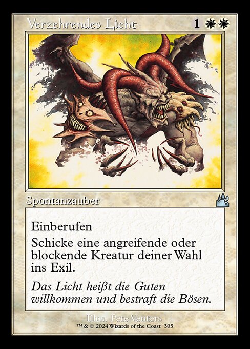 LegalitiesLegal Duel Brawl Penny Predh Legacy Modern Pioneer Vintage Historic Timeless Commander Gladiator Oathbreaker Not Legal Future Pauper Alchemy Standard Oldschool Premodern Standardbrawl Paupercommander RulingsThe declare blockers step is the last chance to cast Devouring Light before creatures deal their combat damage. However, a creature remains an attacking or blocking creature during the combat damage step and end of combat step. Devouring Light may be cast targeting such a creature during those steps, after the creature has dealt combat damage.