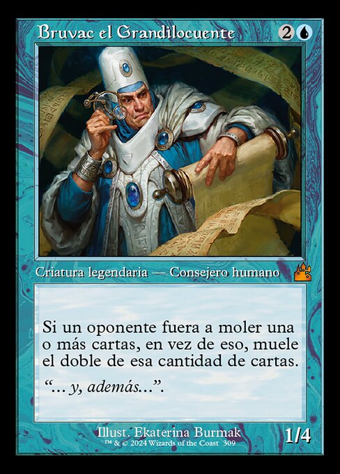 |  Variations : 3Parts— | Bruvac the Grandiloquent1 / 4 If an opponent would mill one or more cards, they mill twice that many cards instead. (To mill a card, a player puts the top card of their library into their graveyard.)