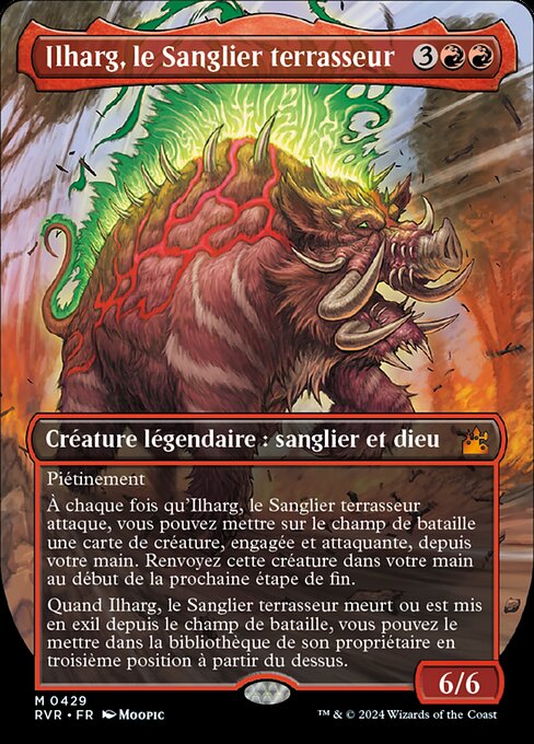 |  Variations : 3Parts— | Ilharg, the Raze-Boar6 / 6 Trample Whenever Ilharg attacks, you may put a creature card from your hand onto the battlefield tapped and attacking. Return that creature to your hand at the beginning of the next end step. When Ilharg dies or is put into exile from the battlefield, you may put it into its owner's library third from the top.