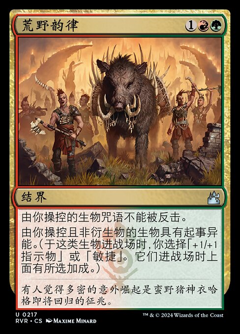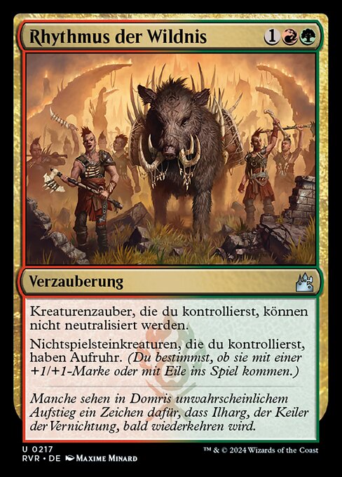 |  Variations : 1Parts— | Ritmo dei SelvaggiLe magie creatura che controlli non possono essere neutralizzate. Le creature non pedina che controlli hanno tumulto. (Entrano nel campo di battaglia con un segnalino +1/+1 o rapidità a tua scelta.)