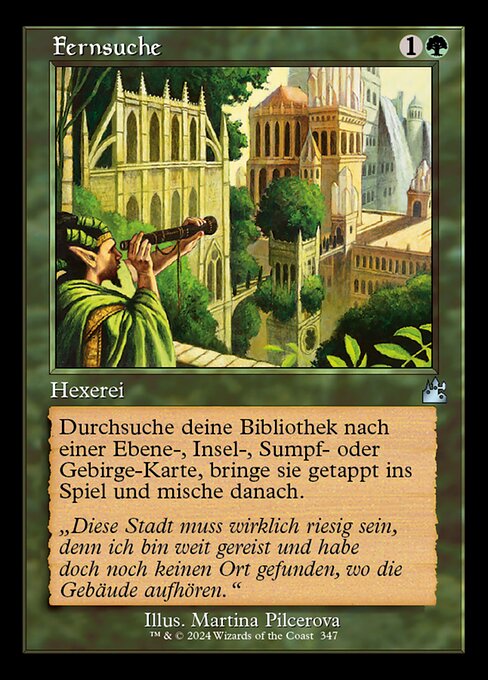 ![]() Variations : 1Parts— | LungosguardoPassa in rassegna il tuo grimorio per una carta Pianura, Isola, Palude o Montagna, mettila sul campo di battaglia TAPpata, poi rimescola.