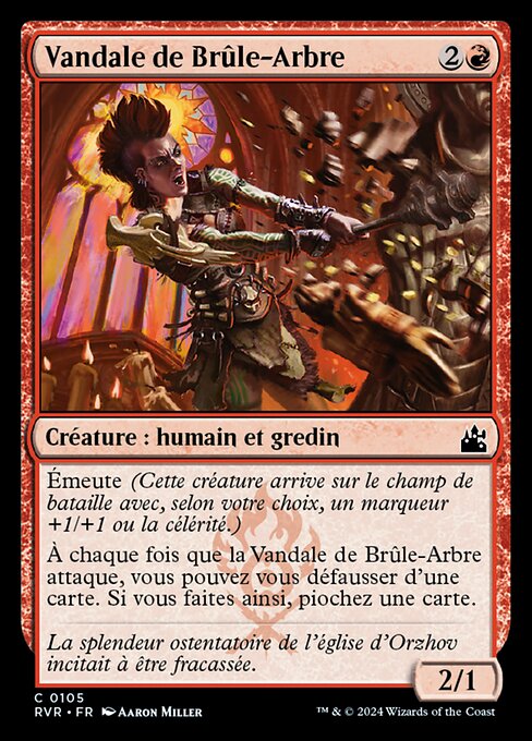 |  Variations— Parts— | Vândala da Árvore Flamejante2 / 1 Tumulto (Esta criatura entra no campo de batalha com um marcador +1/+1 ou ímpeto, à sua escolha.) Toda vez que Vândala da Árvore Flamejante ataca, você pode descartar um card. Se fizer isso, compre um card.