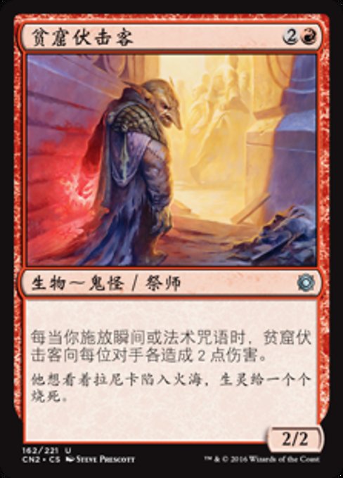 |  Variations : 1Parts— | 贫窟伏击客2 / 2 每当你施放瞬间或法术咒语时,贫窟伏击客向每位对手各造成2点伤害。