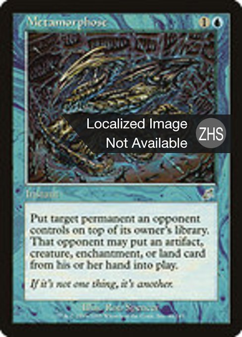 |  Variations— Parts— | MetamorphosePut target permanent an opponent controls on top of its owner's library. That opponent may put an artifact, creature, enchantment, or land card from their hand onto the battlefield.