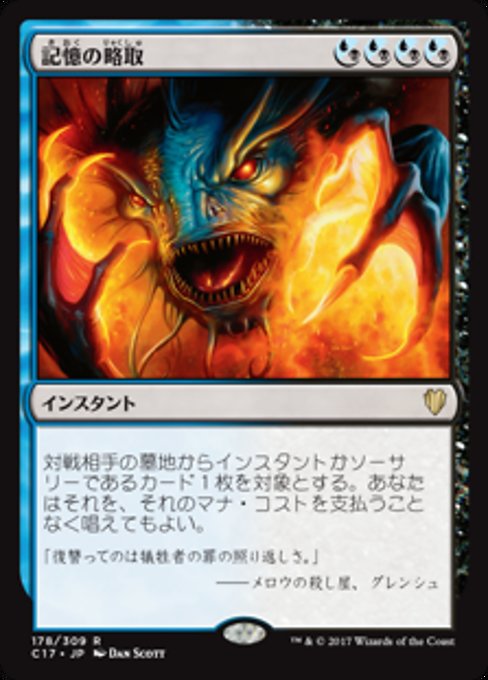 ![]() Variations— Parts— | 記憶の略取いずれかの対戦相手の墓地にある、インスタント・カード1枚かソーサリー・カード1枚を対象とする。あなたはそれを、それのマナ・コストを支払うことなくプレイしてもよい。