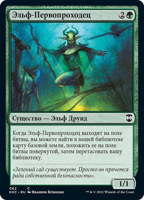 ![]() Variations— Parts— | Эльф-Первопроходец1 / 1 Когда Эльф-Первопроходец входит в игру, вы можете найти в вашей библиотеке карту базовой земли и положить ее в игру повернутой. Если вы это делаете, перетасуйте вашу библиотеку.
