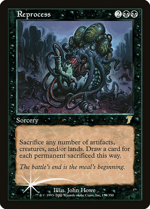 ![]() Variations— Parts— | ReprocessSacrifice any number of artifacts, creatures, and/or lands. Draw a card for each permanent sacrificed this way.
