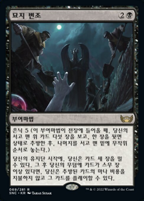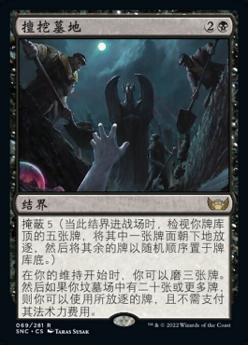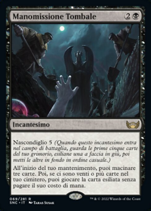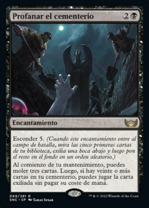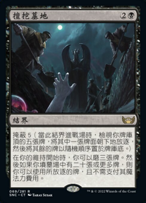 |  Variations : 1Parts— | 墓所細工秘匿5(このエンチャントが戦場に出たとき、あなたのライブラリーの一番上にあるカード5枚を見て、そのうち1枚を裏向きに追放し、その後残りを一番下に無作為の順番で置く。) あなたのアップキープの開始時に、あなたはカード3枚を切削してもよい。その後、あなたの墓地に20枚以上のカードがあるなら、あなたはマナ・コストを支払うことなくその追放されているカード1枚をプレイしてもよい。