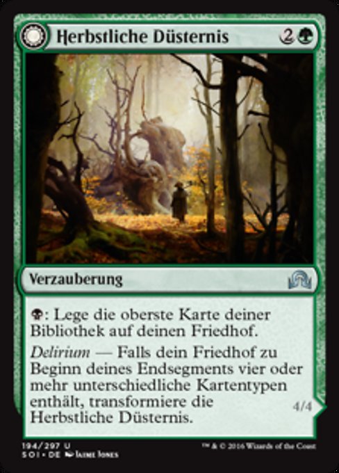 Delirium — Falls dein Friedhof zu Beginn deines Endsegments vier oder mehr unterschiedliche Kartentypen enthält, transformiere die Herbstliche Düsternis.
