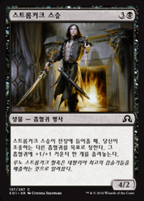 ![]() Variations— Parts— | Stromkirk Mentor4 / 2 When this creature enters, put a +1/+1 counter on another target Vampire you control.