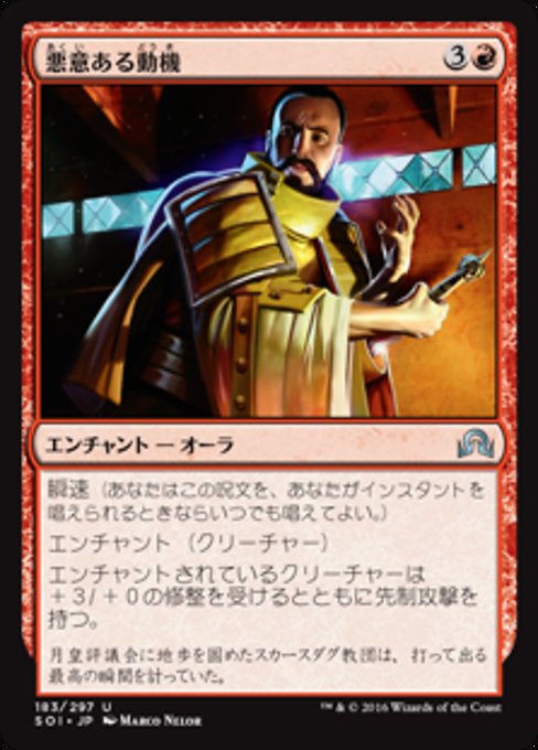 |  Variations— Parts— | Spiteful MotivesFlash (You may cast this spell any time you could cast an instant.) Enchant creature Enchanted creature gets +3/+0 and has first strike.