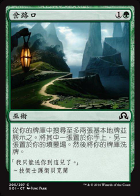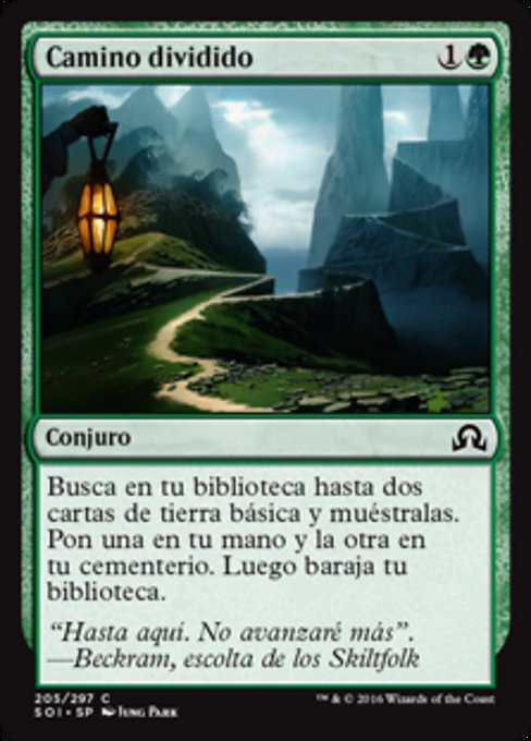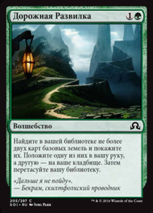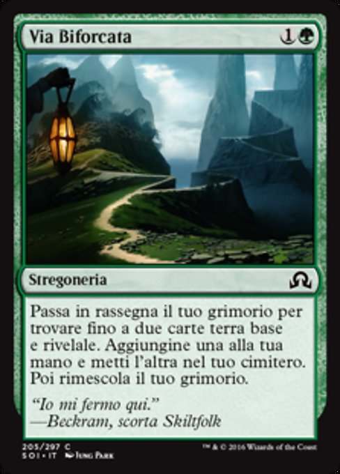 |  Variations— Parts— | Fork in the RoadSearch your library for up to two basic land cards and reveal them. Put one into your hand and the other into your graveyard. Then shuffle.