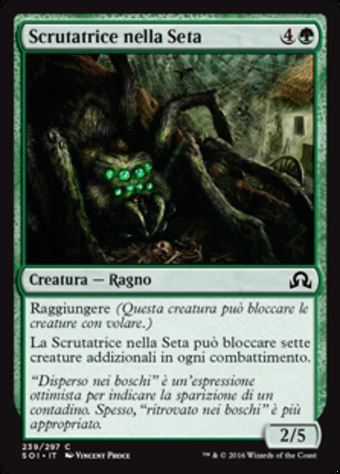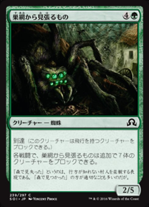 ![]() Variations— Parts— | Watcher in the Web2 / 5 Reach (This creature can block creatures with flying.) This creature can block an additional seven creatures each combat.