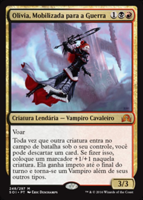 ![]() Variations— Parts— | Olivia, Mobilized for War3 / 3 Flying Whenever another creature you control enters, you may discard a card. If you do, put a +1/+1 counter on that creature, it gains haste until end of turn, and it becomes a Vampire in addition to its other types.