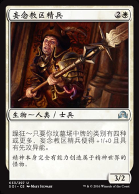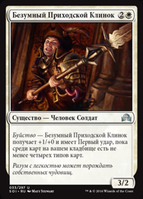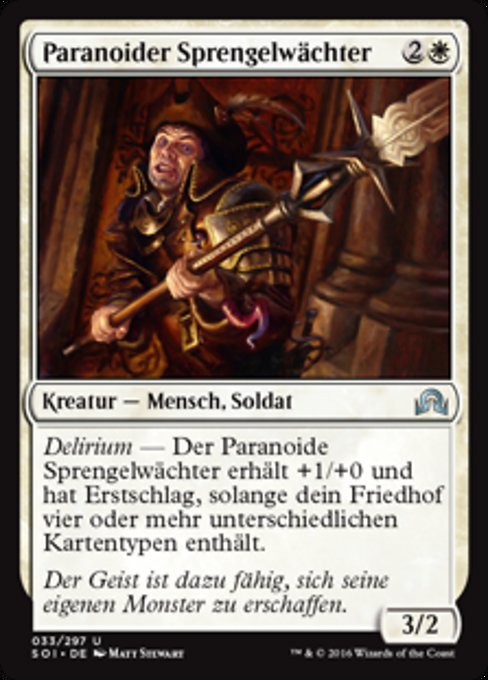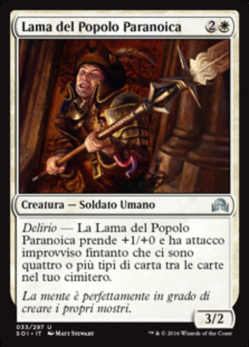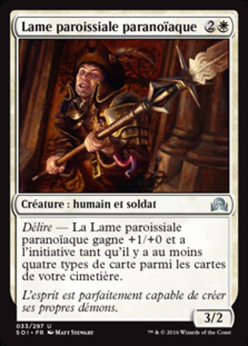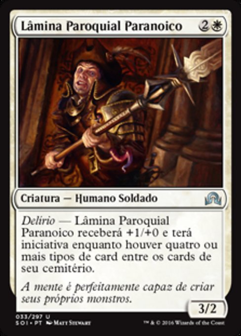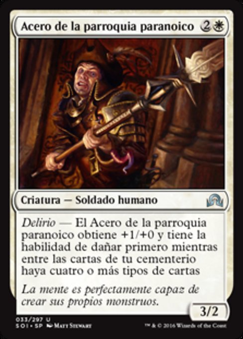 ![]() Variations— Parts— | Paranoid Parish-Blade3 / 2 Delirium — This creature gets +1/+0 and has first strike as long as there are four or more card types among cards in your graveyard.