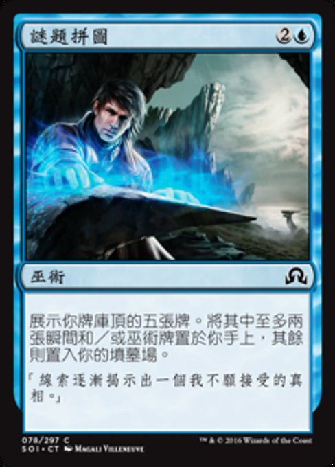 ![]() Variations— Parts— | Pieces of the PuzzleReveal the top five cards of your library. Put up to two instant and/or sorcery cards from among them into your hand and the rest into your graveyard.
