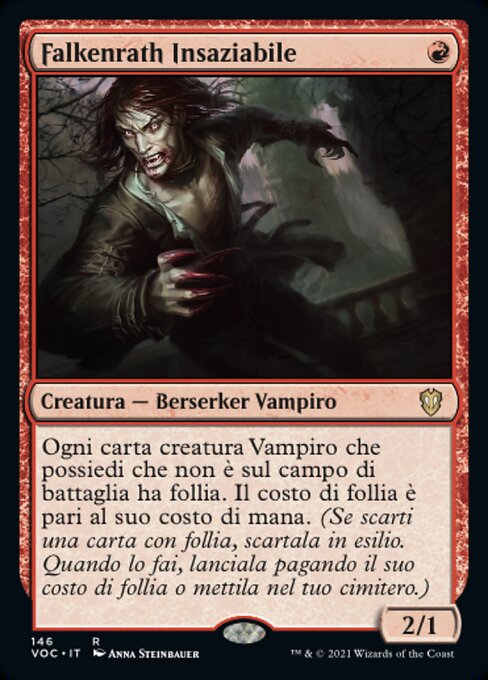 |  Variations— Parts— | Falkenrath Insaziabile2 / 1 Ogni carta creatura Vampiro che possiedi che non è sul campo di battaglia ha follia. Il costo di follia è pari al suo costo di mana. (Se scarti una carta con follia, scartala in esilio. Quando lo fai, lanciala pagando il suo costo di follia o mettila nel tuo cimitero.)