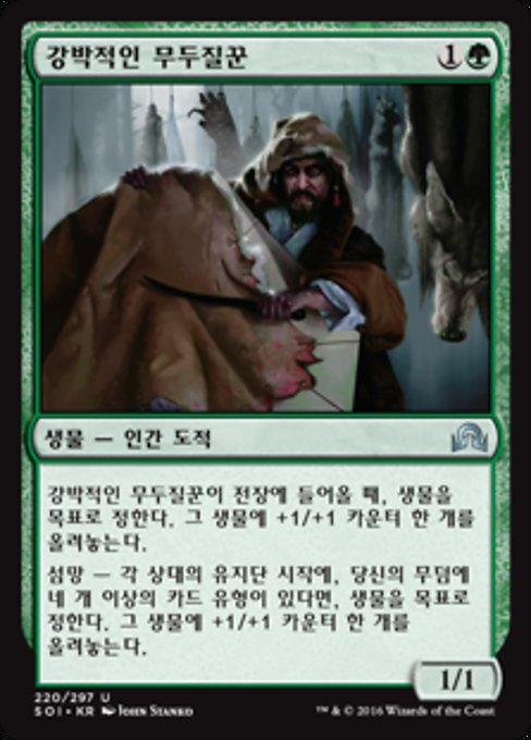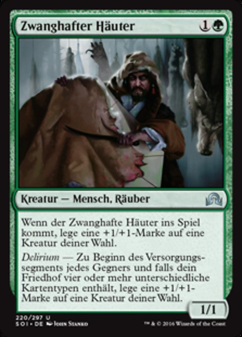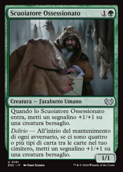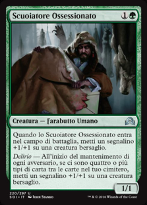 |  Variations— Parts— | Scuoiatore Ossessionato1 / 1 Quando lo Scuoiatore Ossessionato entra nel campo di battaglia, metti un segnalino +1/+1 su una creatura bersaglio. Delirio — All'inizio del mantenimento di ogni avversario, se ci sono quattro o più tipi di carta tra le carte nel tuo cimitero, metti un segnalino +1/+1 su una creatura bersaglio.