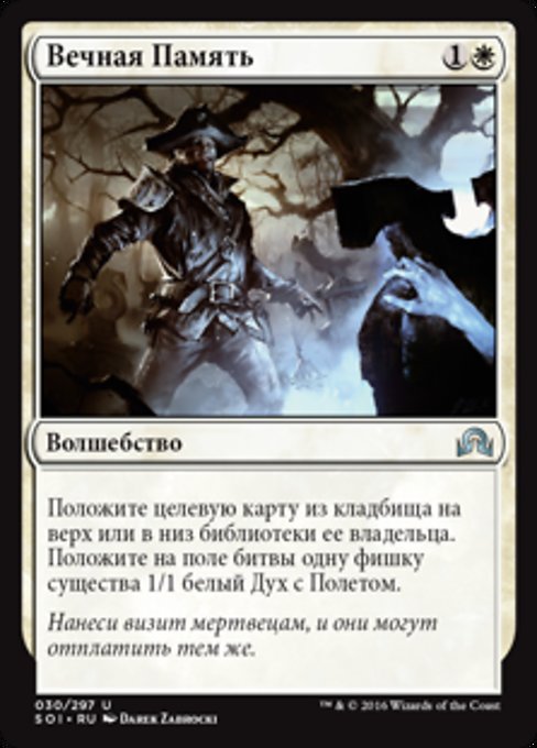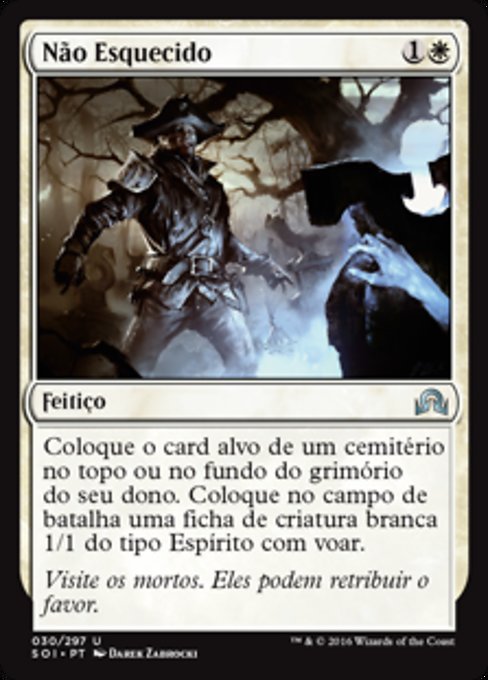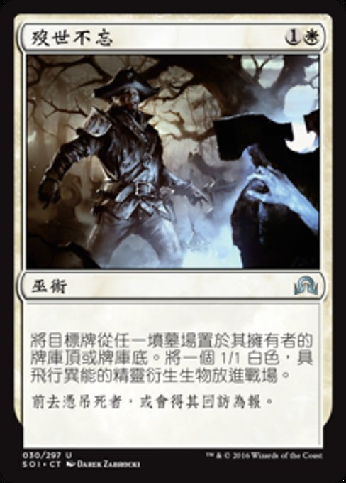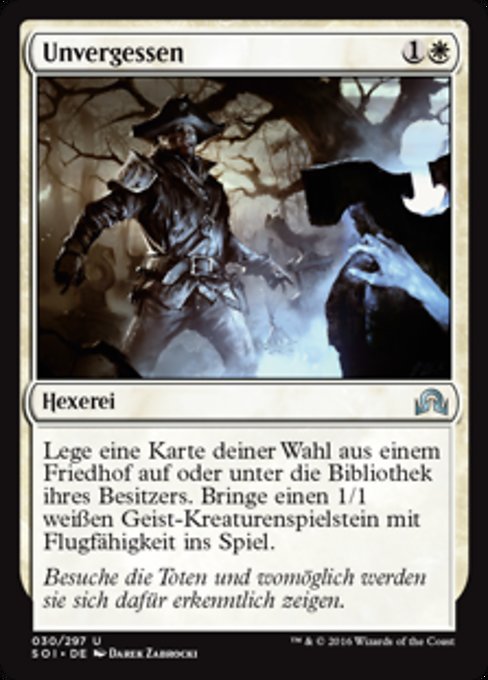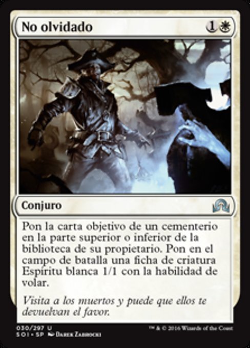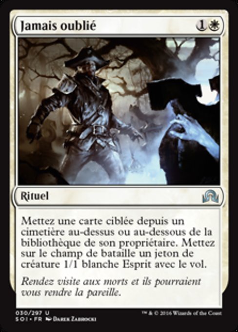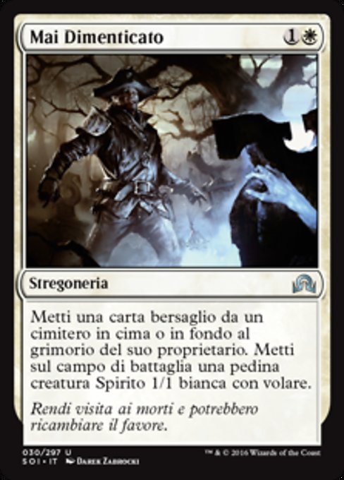 |  Variations— Parts— | Mai DimenticatoMetti una carta bersaglio da un cimitero in cima o in fondo al grimorio del suo proprietario. Metti sul campo di battaglia una pedina creatura Spirito 1/1 bianca con volare.