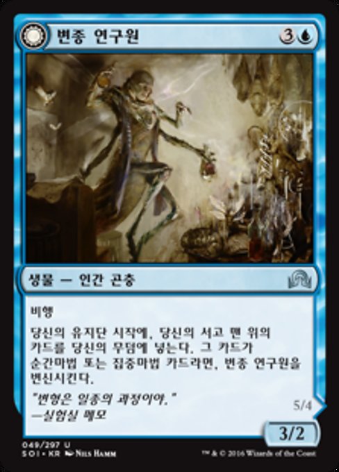 당신의 유지단 시작에, 당신의 서고 맨 위의 카드를 당신의 무덤에 넣는다. 그 카드가 순간마법 또는 집중마법 카드라면, 변종 연구원을 변신시킨다.