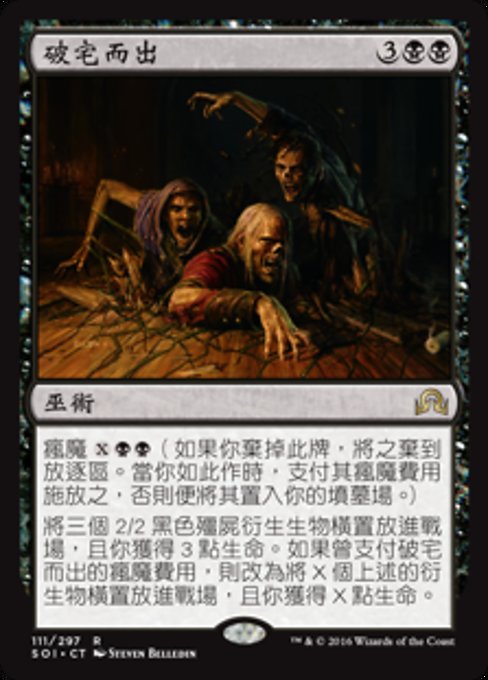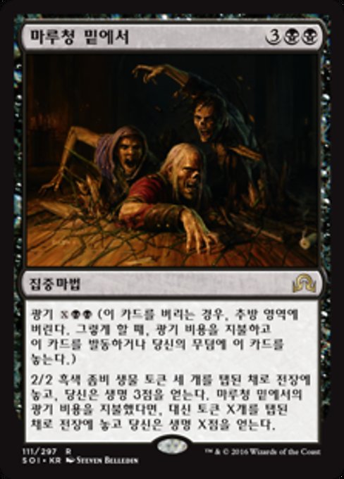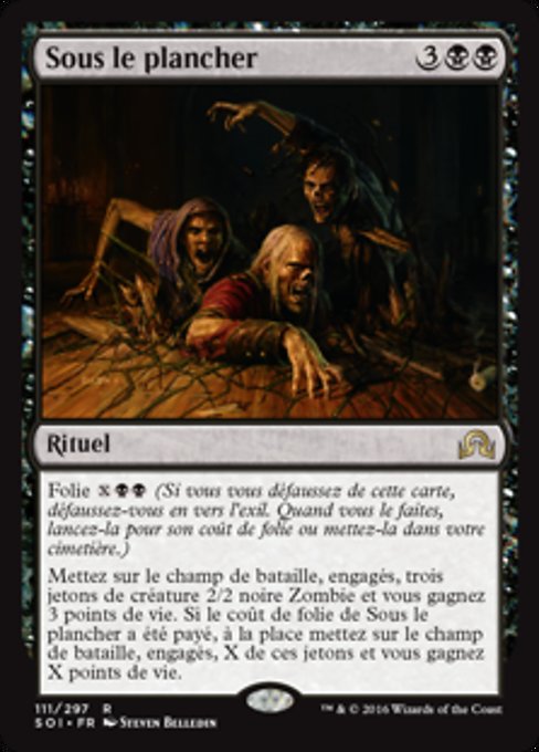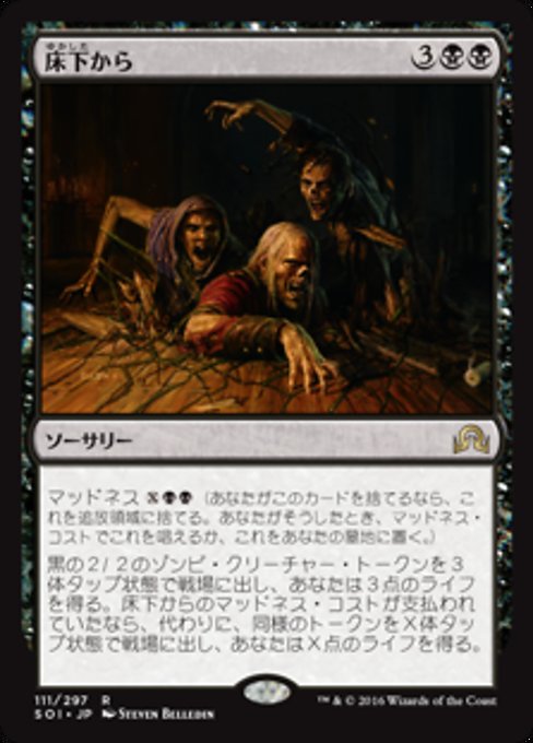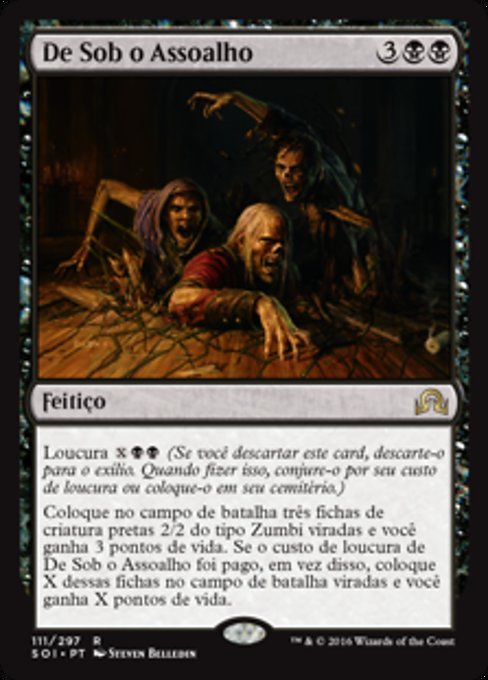 |  Variations— Parts— | De Sob o AssoalhoLoucura  Coloque no campo de batalha três fichas de criatura pretas 2/2 do tipo Zumbi viradas e você ganha 3 pontos de vida. Se o custo de loucura de De Sob o Assoalho foi pago, em vez disso, coloque X dessas fichas no campo de batalha viradas e você ganha X pontos de vida.