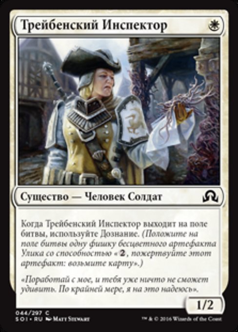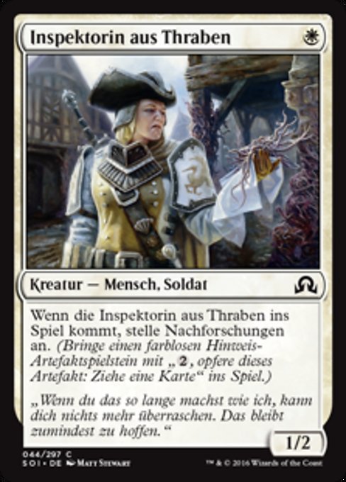 |  Variations— Parts— | Inspetor de Thraben1 / 2 Quando Inspetor de Thraben entrar no campo de batalha, investigue. (Coloque no campo de batalha uma ficha de artefato incolor do tipo Pista com "