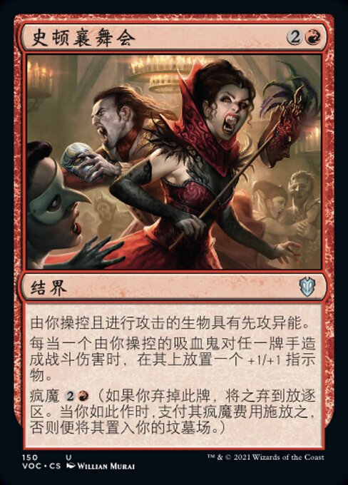 ![]() Variations— Parts— | 史顿襄舞会由你操控且进行攻击的生物具有先攻异能。 每当一个由你操控的吸血鬼对任一牌手造成战斗伤害时,在其上放置一个+1/+1指示物。 疯魔
