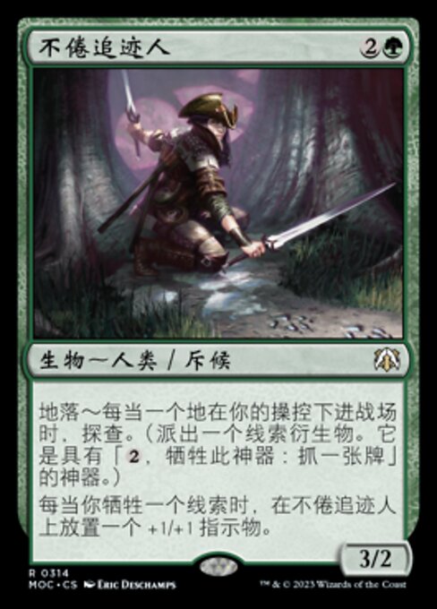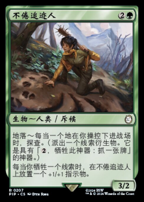 ![]() Variations— Parts— | 不倦追迹人3 / 2 每当一个地在你的操控下进战场时,探查。(将一个无色线索衍生神器放进战场,且其具有「 每当你牺牲一个线索时,在不倦追迹人上放置一个+1/+1指示物。