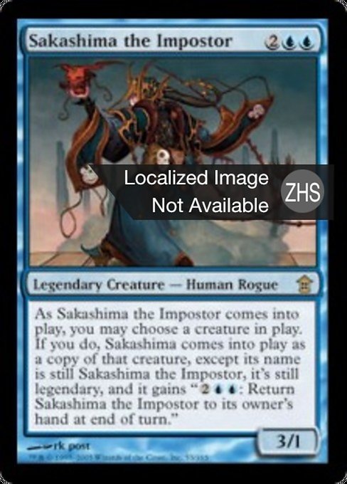 ![]() Variations— Parts— | Sakashima the Impostor3 / 1 You may have Sakashima the Impostor enter as a copy of any creature on the battlefield, except its name is Sakashima the Impostor, it's legendary in addition to its other types, and it has "