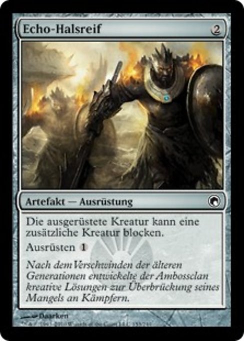 LegalitiesLegal Duel Predh Legacy Modern Pauper Vintage Commander Oathbreaker Paupercommander Not Legal Brawl Penny Future Alchemy Pioneer Historic Standard Timeless Gladiator Oldschool Premodern Standardbrawl RulingsEcho Circlet’s effect is cumulative. If it equips a creature that can already block an additional creature, now it can block three creatures. The same is true if two Echo Circlets equip the same creature, for example.