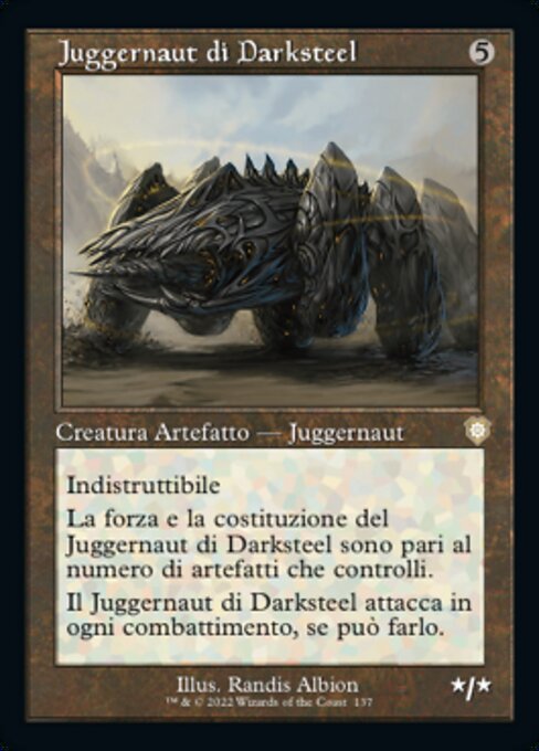 |  Variations— Parts— | Juggernaut di Darksteel* / * La forza e la costituzione del Juggernaut di Darksteel sono pari al numero di artefatti che controlli. Il Juggernaut di Darksteel è indistruttibile e attacca ogni turno, se può farlo.