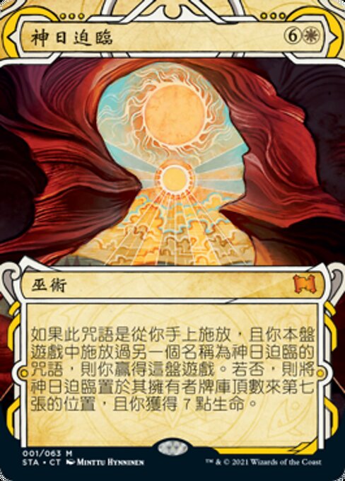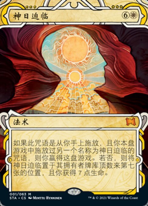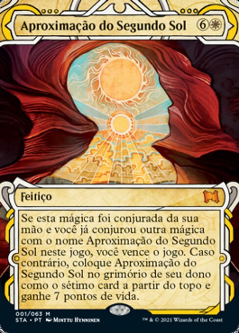 ![]() Variations— Parts— | Approach of the Second SunIf this spell was cast from your hand and you've cast another spell named Approach of the Second Sun this game, you win the game. Otherwise, put Approach of the Second Sun into its owner's library seventh from the top and you gain 7 life.