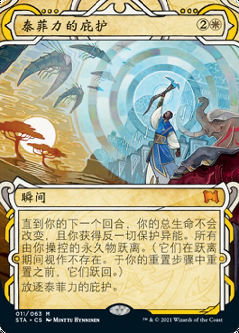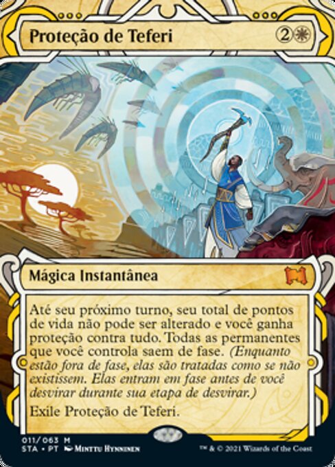 |  Variations— Parts— | Teferi's ProtectionUntil your next turn, your life total can't change and you gain protection from everything. All permanents you control phase out. (While they're phased out, they're treated as though they don't exist. They phase in before you untap during your untap step.) Exile Teferi's Protection.