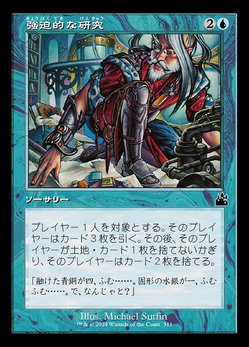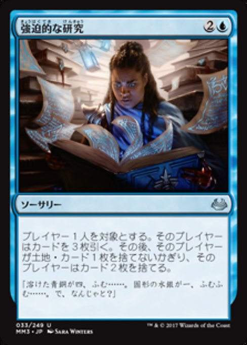 ![]() Variations : 1Parts— | 強迫的な研究プレイヤー1人を対象とする。そのプレイヤーはカードを3枚引く。その後、そのプレイヤーが土地・カード1枚を捨てないかぎり、そのプレイヤーはカード2枚を捨てる。