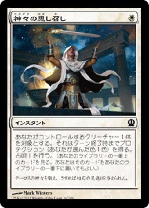 ![]() Variations : 1Parts— | 神々の思し召しあなたがコントロールしているクリーチャー1体を対象とする。色1色を選ぶ。ターン終了時まで、それはプロテクション(その選ばれた色)を得る。(それは選ばれた色のものによっては、ブロックされず、対象にならず、ダメージを受けず、エンチャントされず、装備されない。) 占術1を行う。