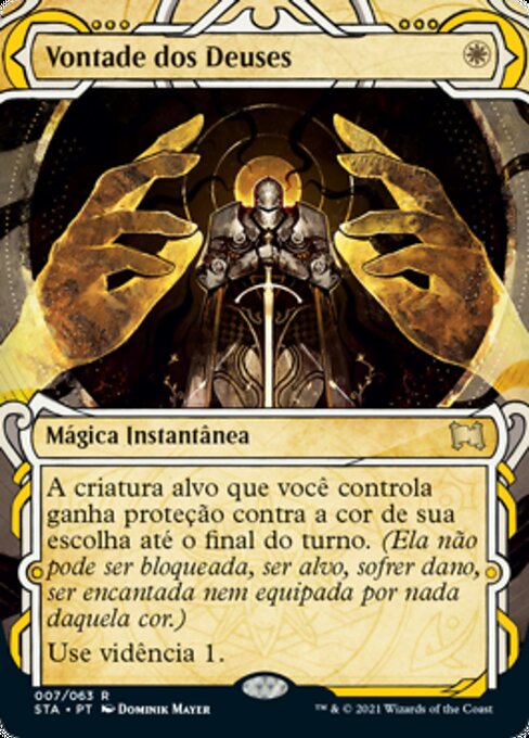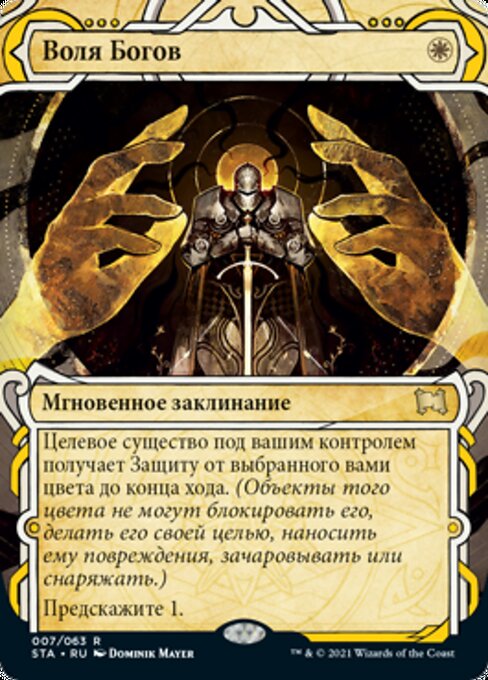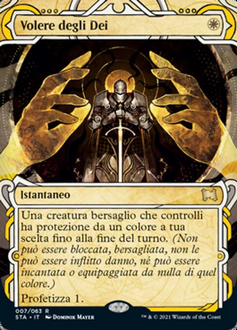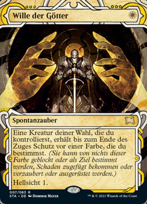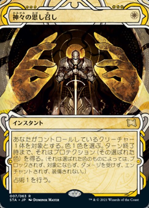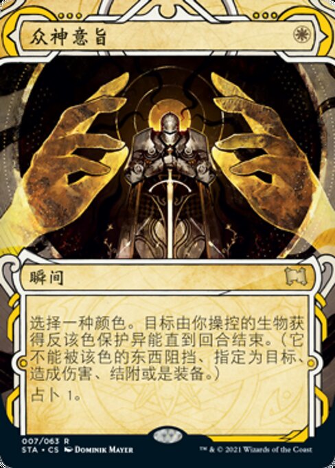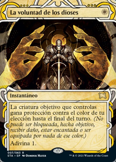 ![]() Variations— Parts— | 眾神意旨選擇一種顏色。目標由你操控的生物獲得反該色保護異能直到回合結束。(它不能被該色的東西阻擋、指定為目標、造成傷害、結附或是裝備。) 占卜1。