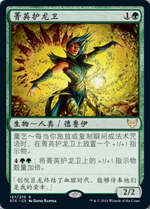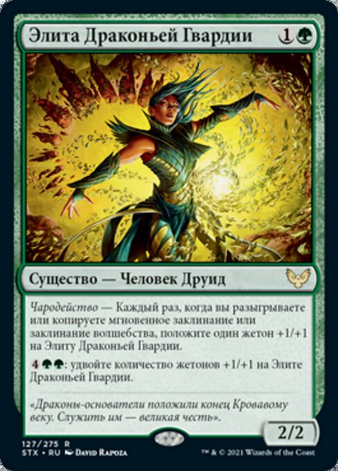 |  Variations : 2Parts— | Dragonsguard Elite2 / 2 Magecraft — Whenever you cast or copy an instant or sorcery spell, put a +1/+1 counter on this creature.