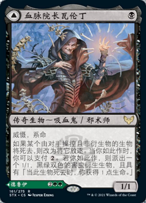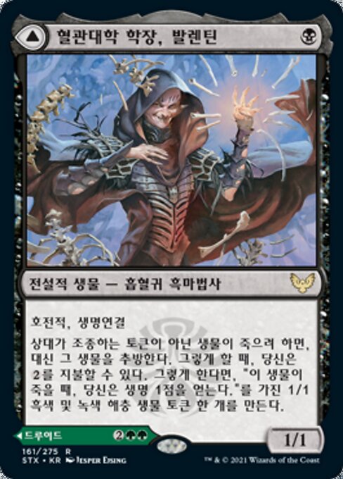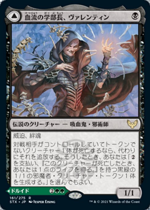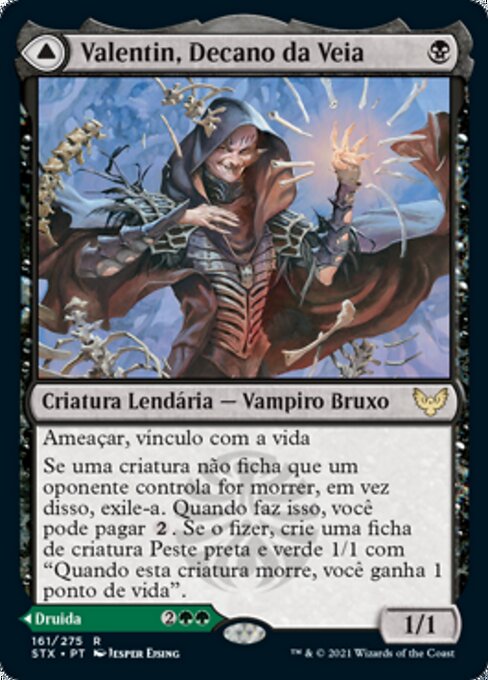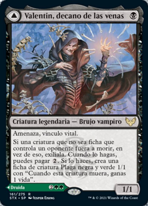 |  Variations : 1Parts : 2 | Valentin, Dean of the Vein1 / 1 Menace, lifelink If a nontoken creature an opponent controls would die, exile it instead. When you do, you may pay