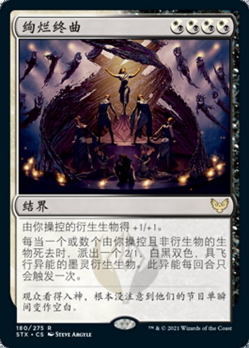 ![]() Variations : 1Parts : 2 | Dramatic FinaleCreature tokens you control get +1/+1. Whenever one or more nontoken creatures you control die, create a 2/1 white and black Inkling creature token with flying. This ability triggers only once each turn.