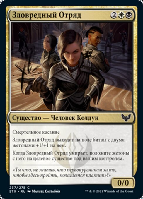 |  Variations— Parts— | Spiteful Squad0 / 0 Deathtouch This creature enters with two +1/+1 counters on it. When this creature dies, put its counters on target creature you control.